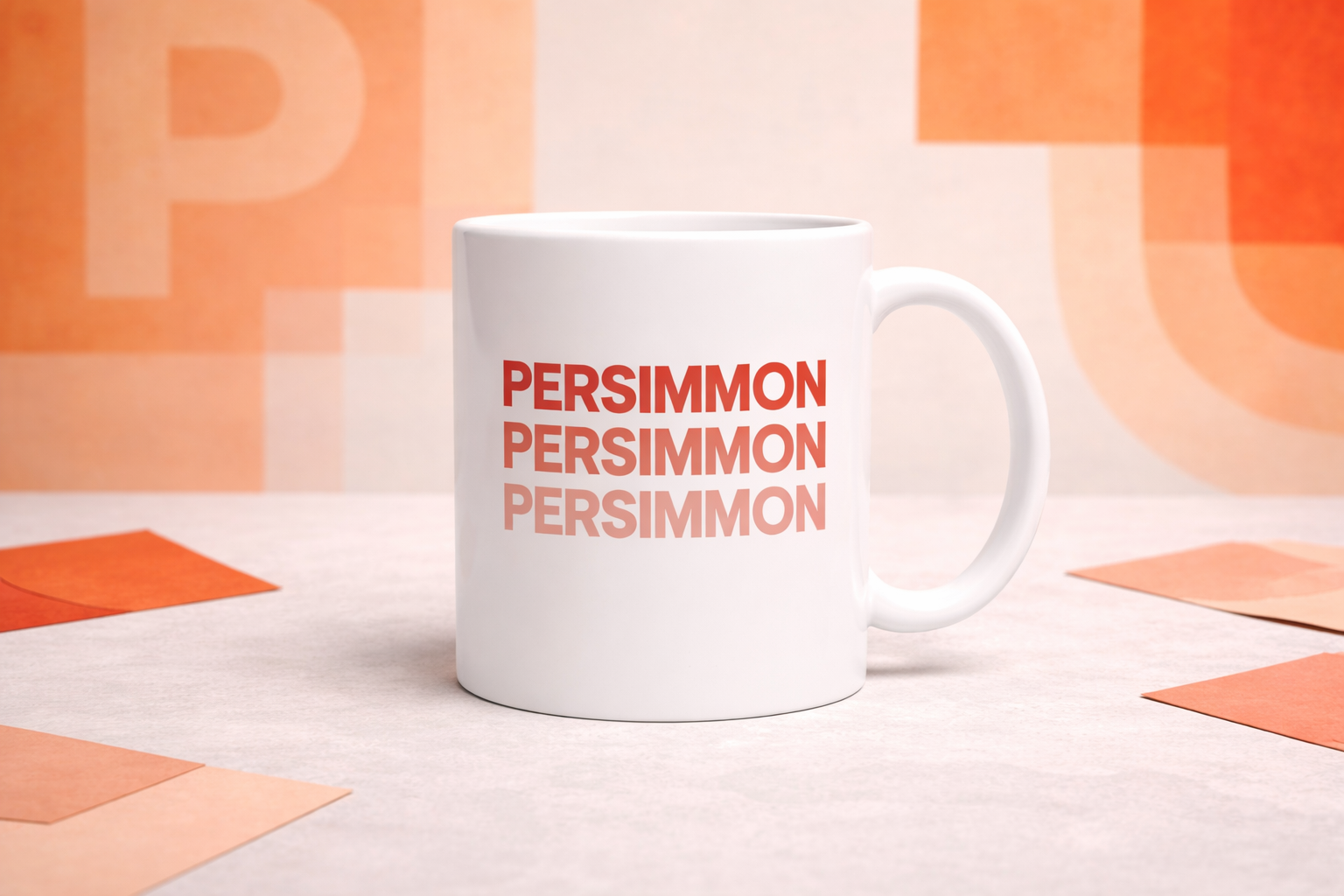 Printed on a clean white ceramic mug, the stacked “Persimmon” text uses subtle tonal variations to create depth without overpowering the minimalist aesthetic.